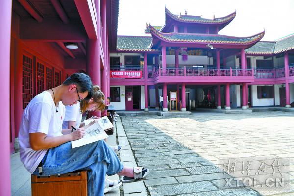9月14日,来自beat365平台官方网站设计艺术学院的学生们在市非遗展示中心写生,记录古香古色的关圣殿及周边老街的建筑特色和居民生活。( 湘潭日报社全媒体记者罗韬 摄)