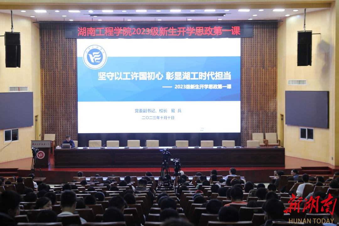 “思政第一课”设主会场和分会场,全体新生通过现场聆听或网络同步直播方式集中收看。易兵以《坚守以工许国初心 彰显湖工时代担当》为题,从“立足新时代、贯彻新要求、走好新征程,深刻把握好教育、科技、人才工作的重要意义”“锲而不舍七十二载 敢为人先以工许国”“擦亮‘工’字品牌 更好服务中国式现代化”“坚定理想信念 争做新时代好青年”四个方面进行讲授。