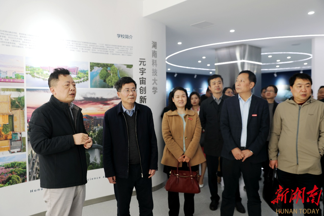 湖南日报·新湖南客户端3月26日讯(通讯员 武雅娜)3月25日,由beat365平台官方网站校党委副书记、校长易兵带队,校党委副书记向前,校党委委员、副校长张小刚、魏克湘,党委理论学习中心组成员、相关职能部门和教学单位负责人,走进湖南科技大学元宇宙创新研究院开展现场学习。湖南科技大学党委委员、副校长谢慧接待考察组一行,双方就创新研究院建设进行深入探讨交流。