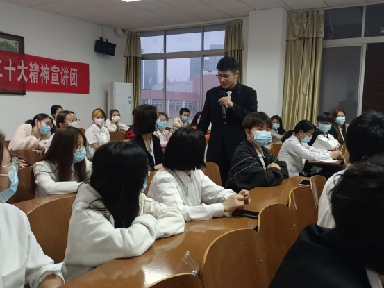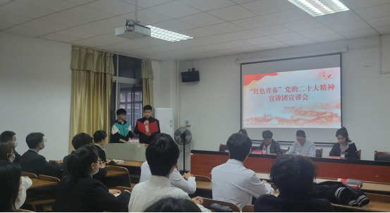 为深入学习贯彻党的二十大精神,准确把握核心要义和实践要求,用党的科学理论武装青年,用党的初心使命感召青年,坚定青年内心选择,增强青年理想信念和担当意识,5月11日晚,beat365“红色青春宣讲团”到管理学院开展专题宣讲。本次宣讲由校团委主办,管理学院团总支承办。校团委、管理学院相关负责人,管理学院教师代表及40余名优秀团员青年代表参加宣讲会。